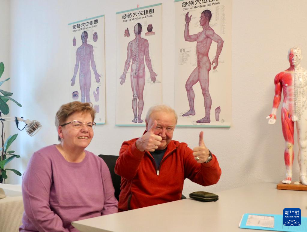 12月11日,在瑞士边境城市沙夫豪森的一家中医诊所,患者莫吉尔(右)称赞中医疗效显著。