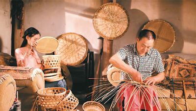 竹编手艺人正在编竹篮。