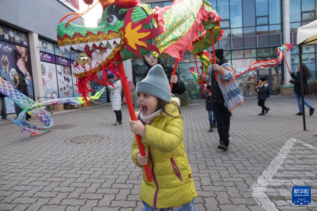 2月3日,在匈牙利布达佩斯唐人街新春庙会上,一名女孩体验舞龙。新华社发(弗尔季·奥蒂洛摄)
