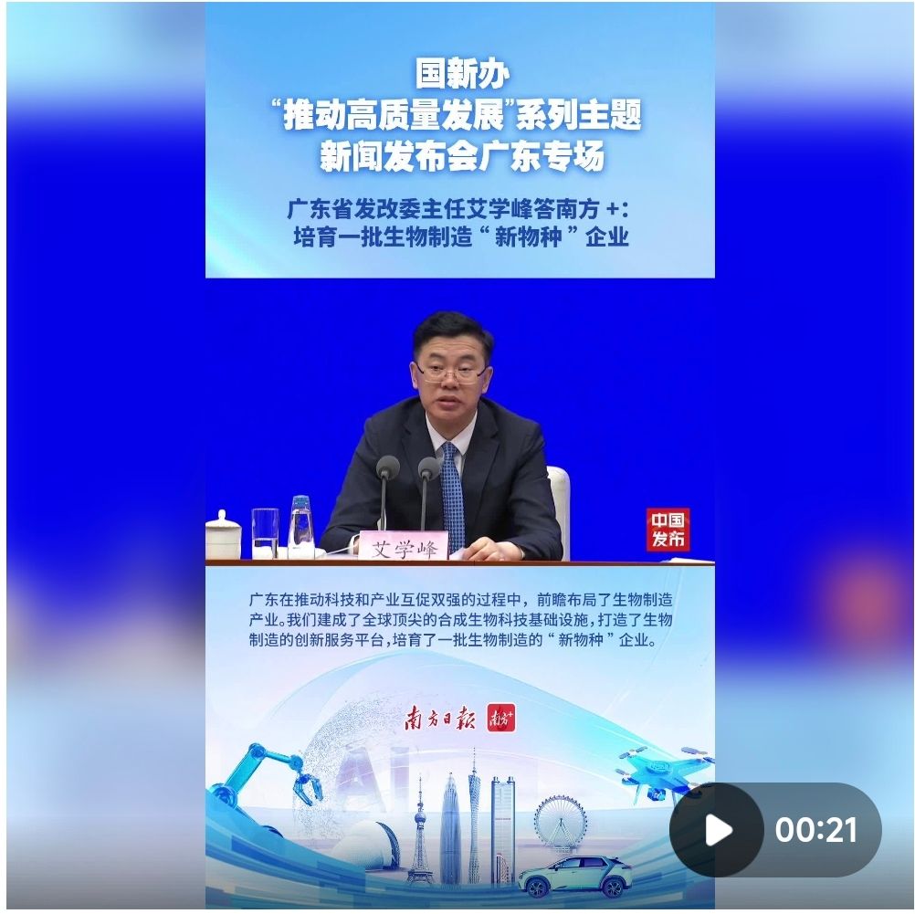生物制造被视为制造领域的一次新的“工业革命”,广东在发展生物制造上有什么考虑?在3月29日国务院新闻办公室举行的“推动高质量发展”系列主题新闻发布会广东专场,南方日报、南方+记者就此提问。广东省发改委主任、省大湾区办主任艾学峰回应时表示,广东在推动科技和产业互促双强的过程中,前瞻布局了生物制造产业,接下来要紧抓机遇,进一步加快发展生物制造产业。
