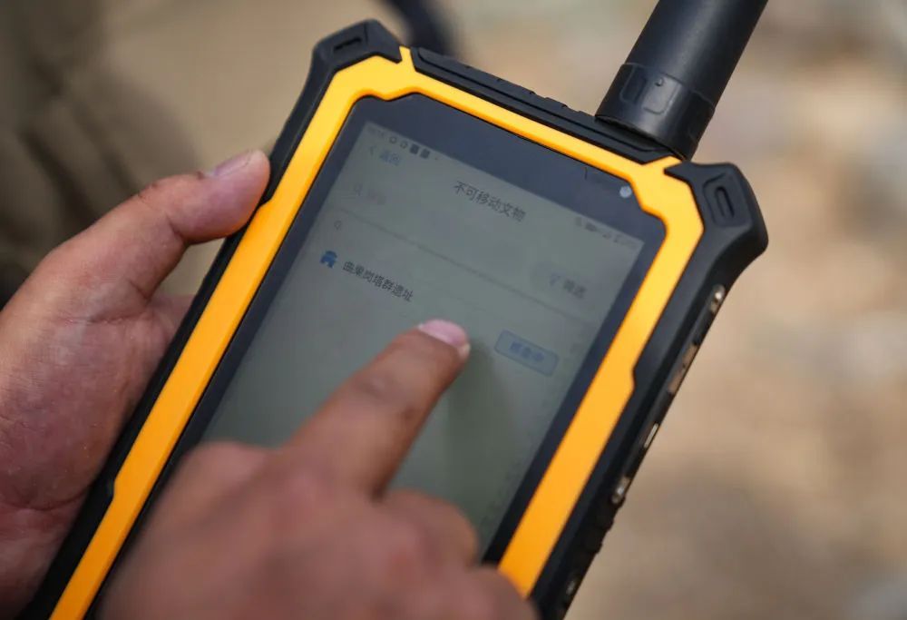 4月11日,普查人员手持移动端数据采集设备在曲果岗塔群遗址现场开展数据采集。新华社记者 晋美多吉 摄