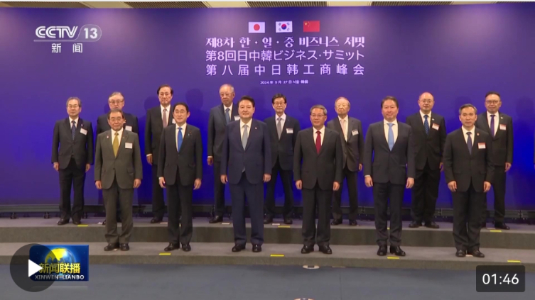 据央视新闻客户端消息(新闻联播):当地时间27日中午,国务院总理李强在首尔与韩国总统尹锡悦、日本首相岸田文雄共同出席第八届中日韩工商峰会并致辞。