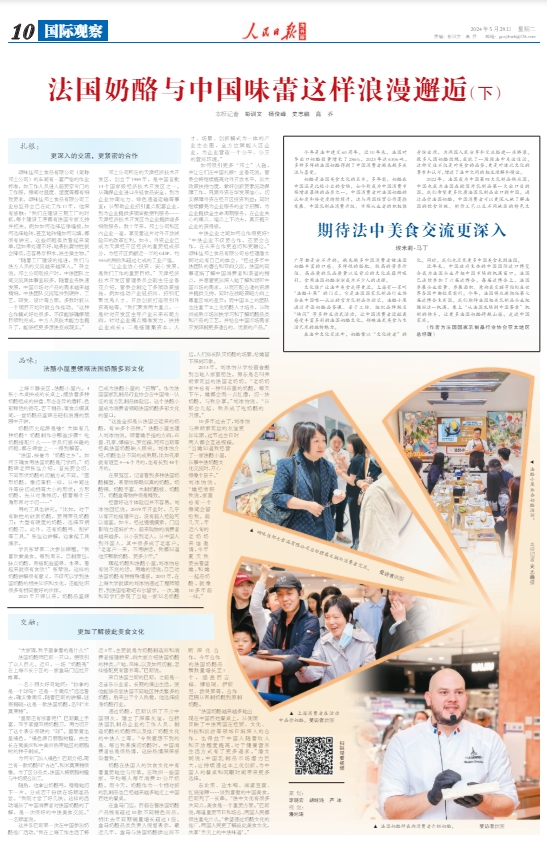 “法国奶酪越来越多地出现在中国百姓餐桌上,从侧面反映了中法两国在经贸、文化、科技和旅游等领域日渐深入的合作,也得益于中国人随着收入和开放程度提高,对于健康营养生活方式有了更多追求。”潘文娴说,中国乳制品市场潜力巨大,应持续通过本土化创新,为中国人的餐桌和闲暇时间带来更多选择。