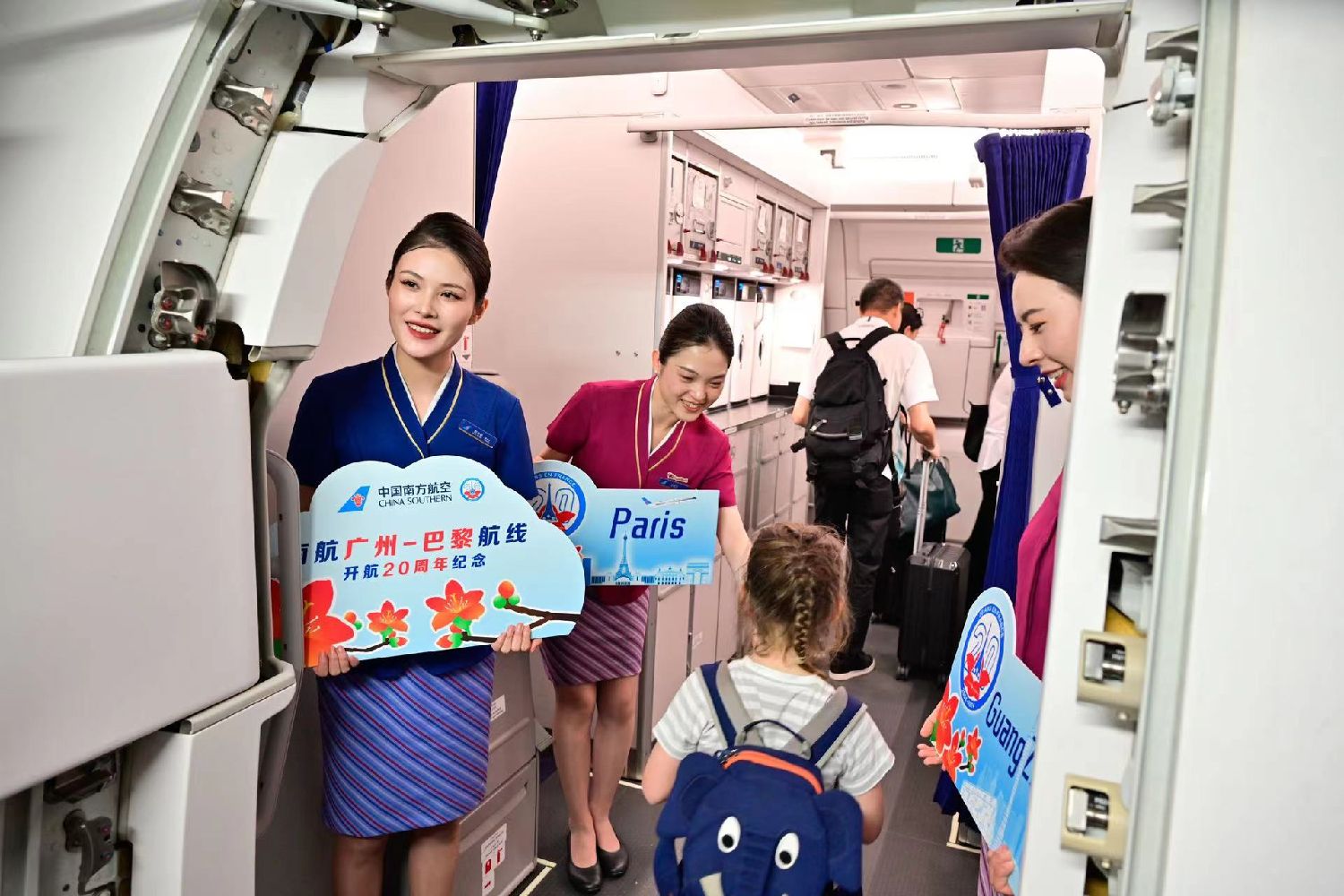 2004年6月28日,南航正式开通广州至巴黎直飞航线,搭建起了千年商都至浪漫之都的空中丝路,填补了我国华南地区至法国巴黎无直飞航线的空白。20年来,南航积极服务中欧、中法经贸、文化、旅游事业发展,牢牢把握发展机遇,不断丰富航空产品、提升“亲和精细”的服务体验,推动中法交流的“空中桥梁”越飞越宽。截至目前,南航已累计执行广州巴黎往返航班9650班次,累计运送中外旅客达到187.1万人次。