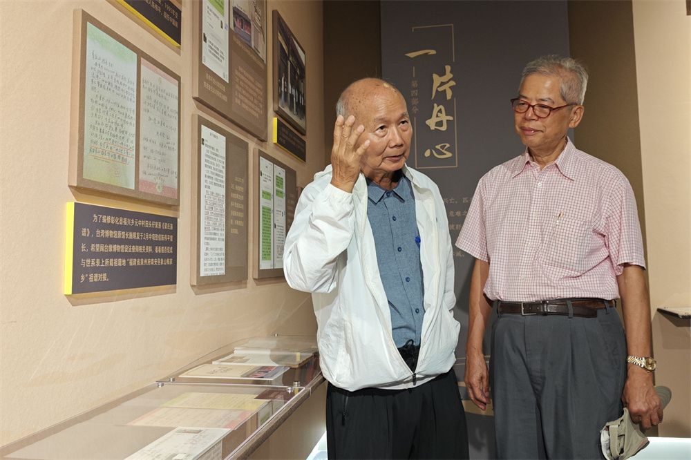 7月19日,施明发(左)在中国闽台缘博物馆讲述两岸梁氏家族的族谱对接故事。(图片来源:中新社)