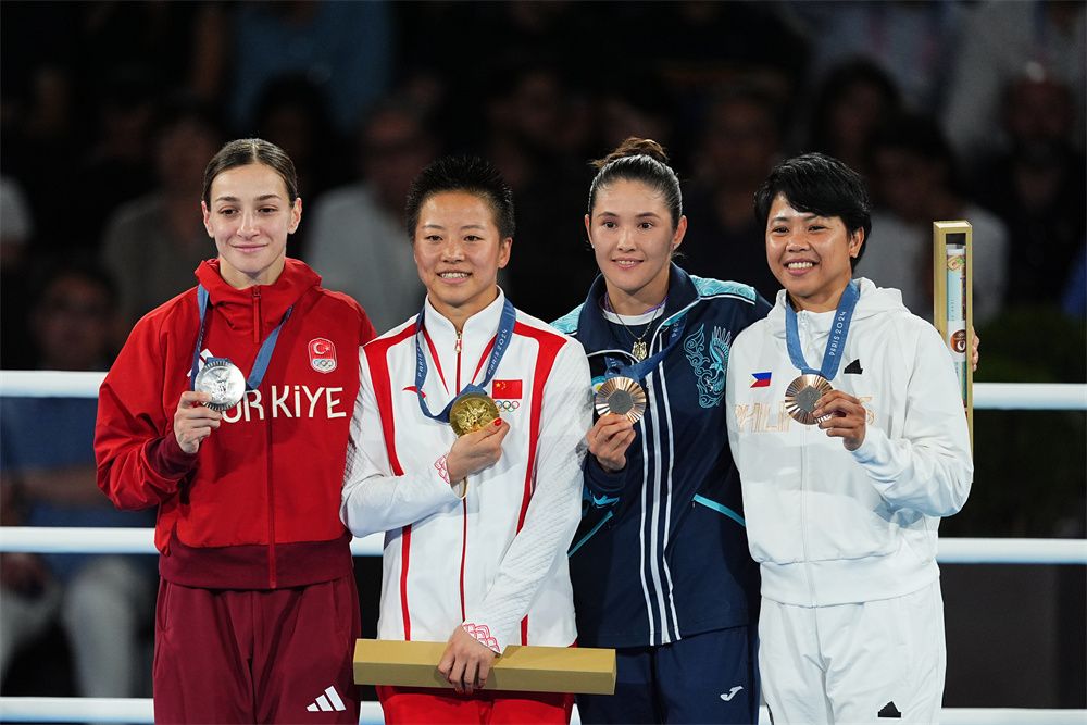当地时间8月9日,获奖选手在领奖台上合影。当日,在巴黎奥运会拳击项目女子50公斤级决赛中,中国选手吴愉战胜土耳其选手卡基罗格鲁,夺得金牌。