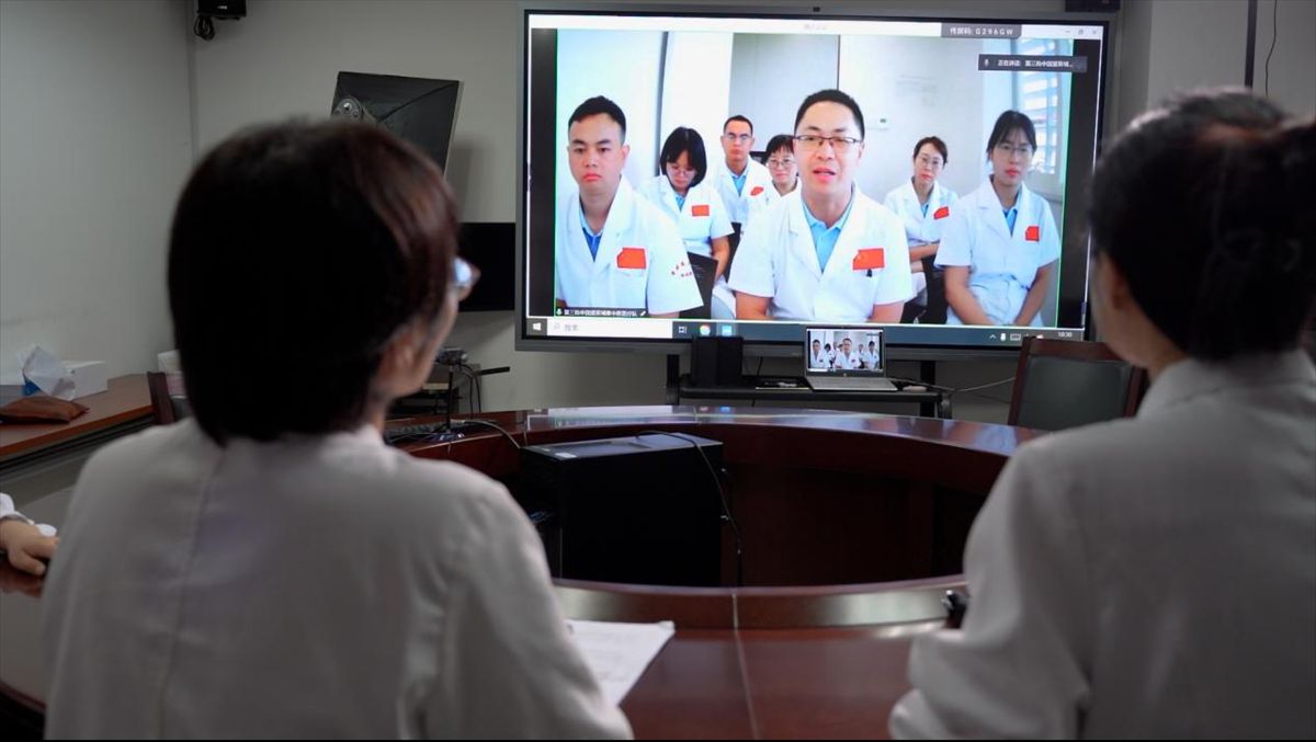 首批中国援柬中医抗疫医疗队的队长樊茂蓉与副队长张艳虹正在和身处柬埔寨的第三批中国援柬中医医疗队进行远程连线。 海外网 康杰/摄