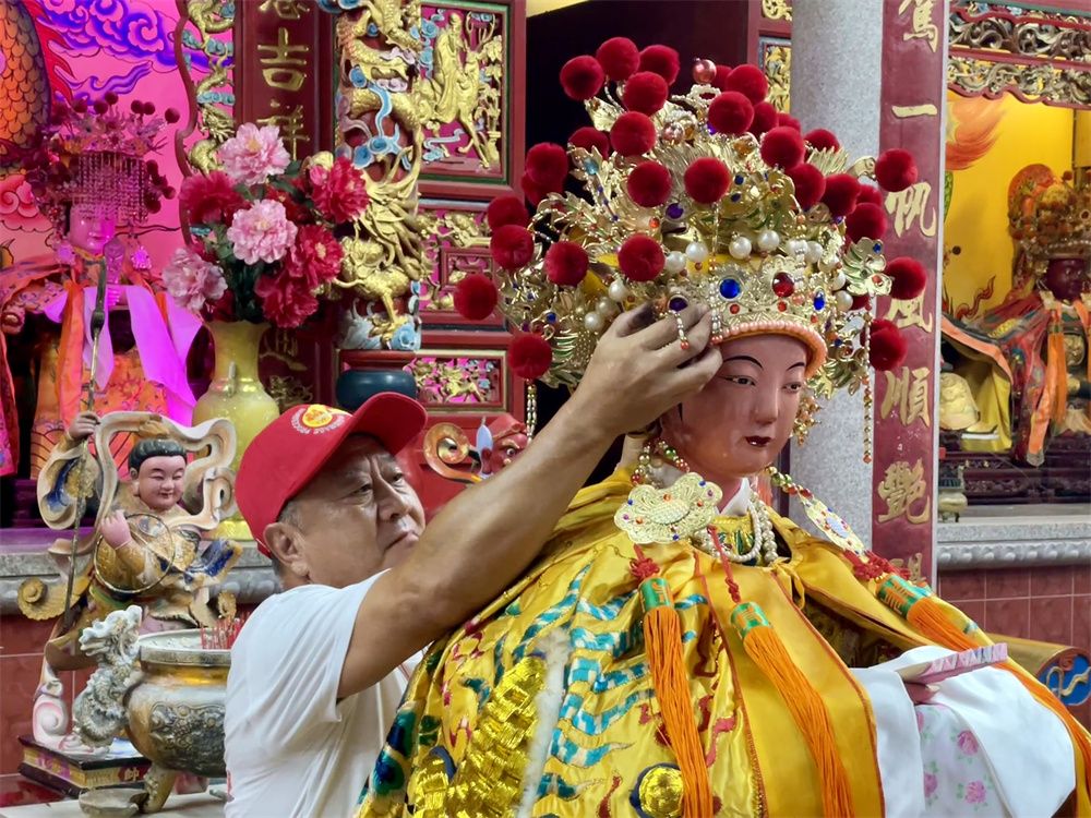 9月13日,在石浦镇海神庙,台胞柯受雄为“如意娘娘”金身整理衣冠。(图片来源:中新社)