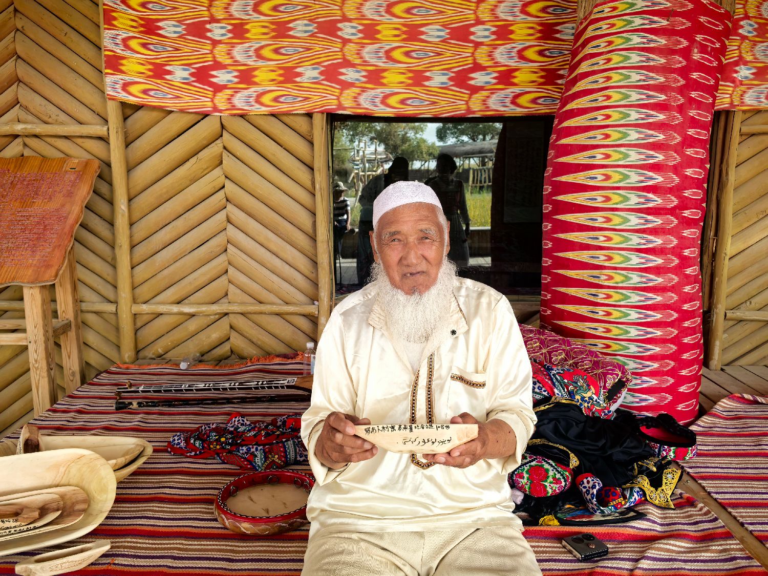 同样生活在村寨的还有远近有名的长寿老人苏来曼·托合提。108岁的苏来曼须发皆白却精神矍铄,闲暇时,他会用胡杨木制作缩小版“卡盆”等手工艺品售卖,也会即兴演奏起都塔尔,有游客想要互动合影,他也来者不拒。