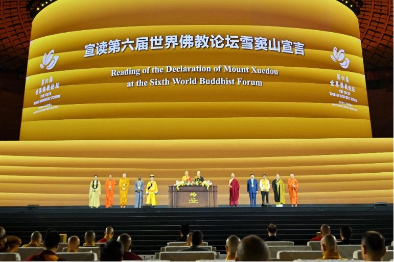 由中国佛教协会、中华宗教文化交流协会主办的第六届世界佛教论坛17日在浙江宁波闭幕。雪窦山下,中外高僧大德、专家学者沟通对话,热议佛教文化精髓、思想内涵,推动文明交流互鉴。世界佛教论坛,是由中国发起主办的国际性佛教多边交流对话机制,过去五届,活动足迹遍及两岸及香港。