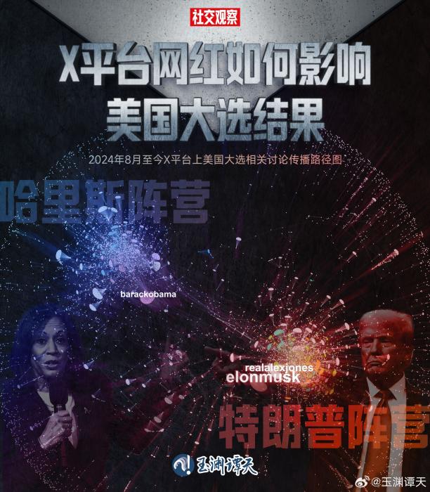 因此,今年出现了一些特殊现象,比如亿万富翁和全球顶流歌手都公开表示支持不同的候选人,其中很大一部分原因,就是为了争取更多的新选民加入。两位候选人都将目标对准了这群人,早早利用社交媒体开启“疯狂营销模式”。从8月至今,“X”平台上围绕美国大选的讨论平均每天超过118万条,而且传播路径呈现明显的阵营态势(见图)。从传播路径图上可以看到,特朗普阵营呈现出声量更大、意见领袖更多的优势,转发互动关系也比哈里斯更紧密。其中,影响力最大的是“X”平台“头号网红”马斯克,其互动量是第二名美国“网红主播”亚历克斯·琼斯(同样支持特朗普)的1.57倍,是哈里斯阵营里最大意见领袖,美国前总统奥巴马的2.1倍。有数据显示,在“X”平台上,近六成用户年龄在35岁以下,这样的传播影响力差距对年轻人的影响不容小觑。