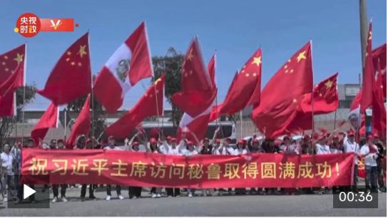 习近平乘车从机场赴下榻饭店途中,华侨华人、中资机构、留学生代表和当地民众在道路两旁夹道欢迎,挥舞中秘两国国旗,高举“祝习近平主席访问秘鲁取得圆满成功!”“中秘友谊万岁!”等红色横幅,敲锣打鼓,舞龙舞狮,热烈欢迎习近平到访。