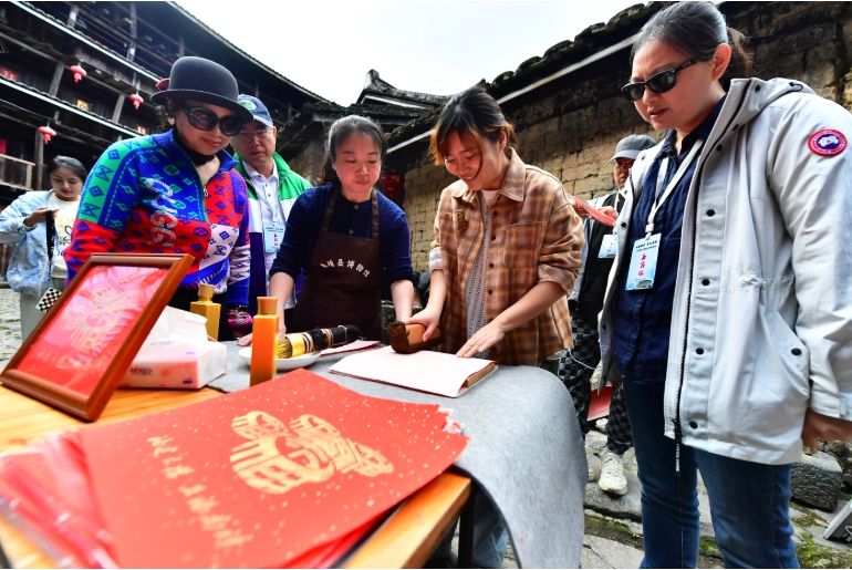 12月4日,福建省南靖县,海外华文媒体代表走进世界文化遗产地感受土楼魅力。图为海外华文媒体代表在裕昌楼内体验漳州木版年画拓印。(图片来源:本文图片均据中新社)