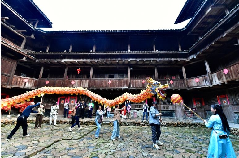 12月4日,福建省南靖县,海外华文媒体代表走进世界文化遗产地感受土楼魅力。图为海外华文媒体代表在田中赋土楼群体验舞龙。