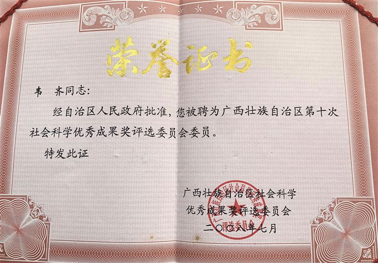 1996年,韦齐回到南宁定居。原本可以休闲地安度晚年了,他却没有停下前进的步伐,犹以余光余热奉献社会。