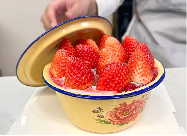 2024年12月,山东烟台一家甜品店,烘焙师展示刚做好的搪瓷盆草莓蛋糕。(图片来源:本文图片均据中新社)