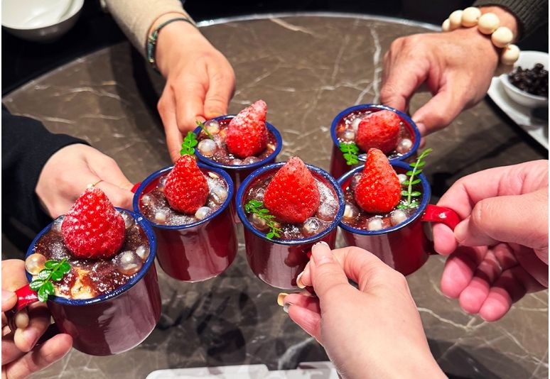 2024年12月,山东烟台,几名年轻人用搪瓷杯甜品“干杯”。