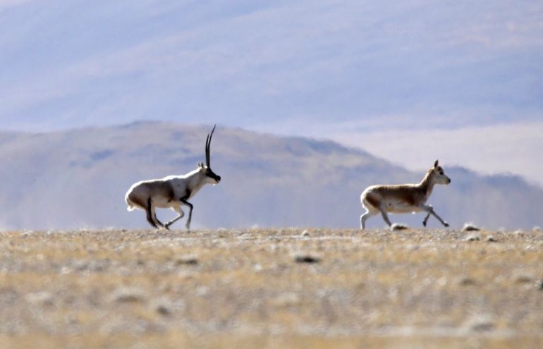 栖息在鲁确塘草原的雄性藏羚羊正在追逐雌性藏羚羊。(图片来源:本文图片均据中新社)