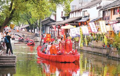 浙东运河是中国大运河的重要组成部分。经过保护传承利用,这条千年文脉焕发新生机。图为浙东运河上举办的水上婚礼。