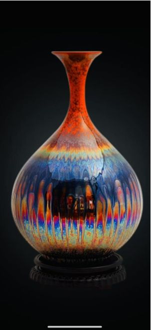 所谓“窑变釉”,即器物在窑内烧成时,由于窑中含有多种呈色的化学元素,经过氧化或还原作用,出窑后呈现意想不到的釉色效果。