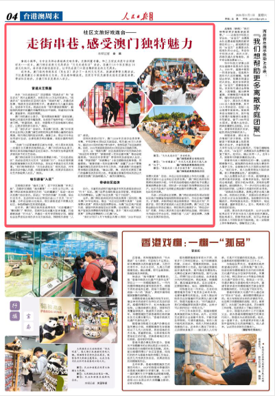近日,由“周游列澳”社区旅游资助计划支持举办的“戏说百年导赏团”“新春戏班×花车创意市集”等活动相继亮相。“戏说百年导赏团”带领市民及游客深入社区,沿着“声画寻踪”“旧城舞台”2条主题路线走街串巷,寻幽探胜;“新春戏班×花车创意市集”设置了20余个零售及餐饮摊位及迷你花车手作工作坊,并邀请澳门本地演员带来精彩话剧表演。“演出以歌、舞、戏的形式展现了澳门的盛事活动及好玩之处,希望通过表演及相关活动让大家感受到澳门的独特魅力。”演员刘漪琳说。