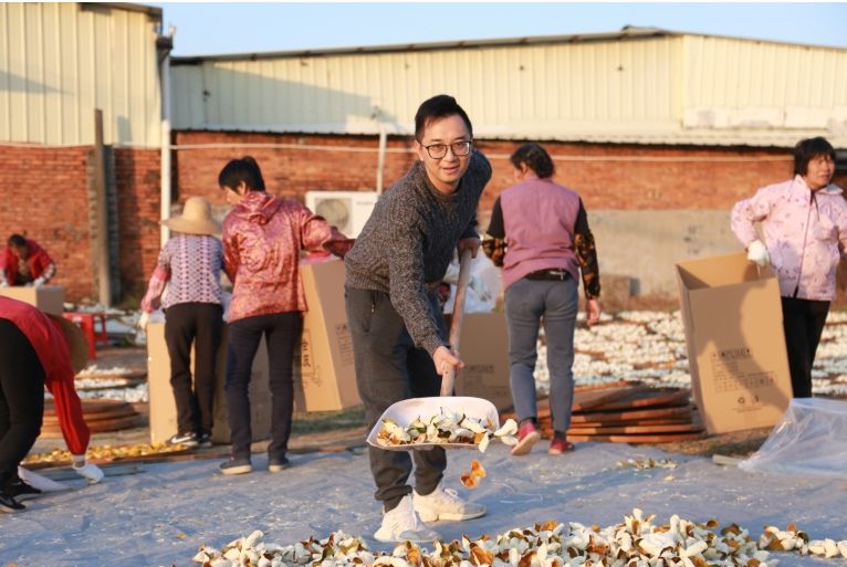 2022年12月,梁伟钊与工人们一起打理晒干的新会陈皮。(图片来源:中新社)