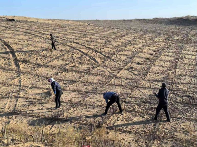2025年3月,在库布其沙漠上植树的农民们。(图片来源:中新社)