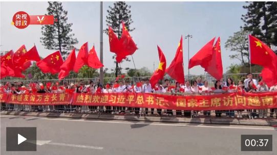 习近平乘车从机场赴下榻饭店途中,中越两党两国旗帜迎风飘扬,“中越友谊万古长青”、“山水相连,命运与共”、“中越情谊深,同志加兄弟”等红色横幅鲜艳夺目。当地民众和中资机构、留学生代表聚集在道路两旁,热烈欢迎习近平到访。