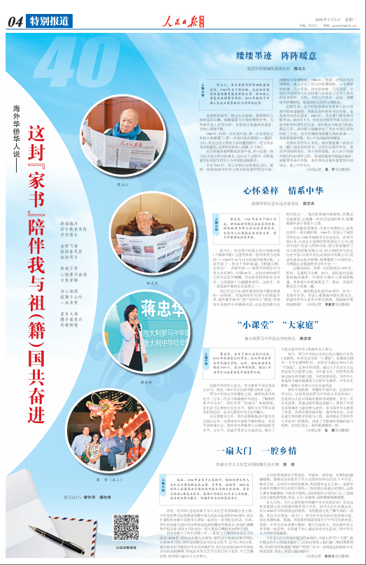 讲好中国故事、传播好中国声音、弘扬好中华文化,这是我创办罗马中华语言学校的初心,也是我与人民日报海外版的共同愿景。作为一名忠实读者,我透过海外版这扇窗口,看到了中国在各领域的飞速发展与进步;身为海外华文教育工作者,我多次接受海外版、海外网采访,分享在意大利的教学经验与心得。海外版还为华侨华人开设专门的版面,讲述了无数海外侨胞的奋斗故事。对我们而言,海外版就像家一样。(记者 金晨采访整理)