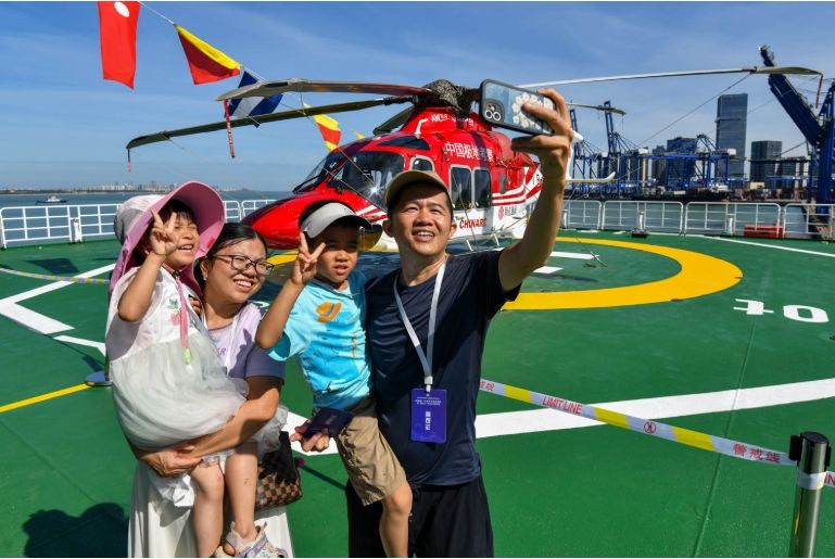 6月2日,参观者在“雪龙2”号极地科考破冰船飞行平台自拍合影。