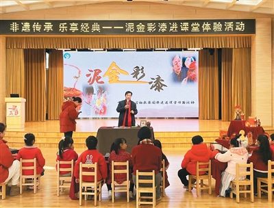 黄才良在非遗进课堂体验活动中为孩子们介绍泥金彩漆。