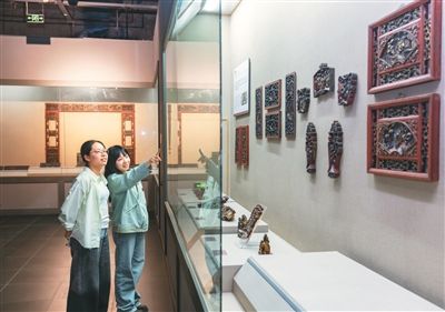 参观者在宁波宁海东方艺术馆参观泥金彩漆器物。