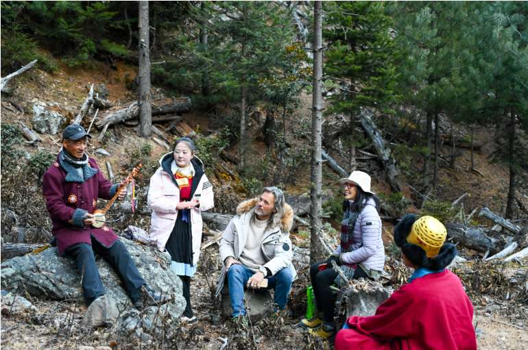 深入白马雪山国家级自然保护区的林间小道,一小支由中外登山者组成的徒步队伍正向雪山观景位前行。玉杰村村民达瓦此里是小队向导,一路上,身着藏装的他一面导航,一面讲解着当地的煨桑仪式、锅庄舞蹈和古老建筑。