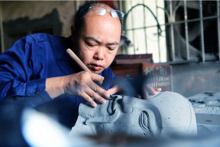 2020年8月,何世良为沙湾古镇《古韵薪火•盛世腾芳》雕琢北帝像。(图片来源:本文图片均据中新社)