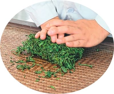 揉捻中的雨花茶叶。
