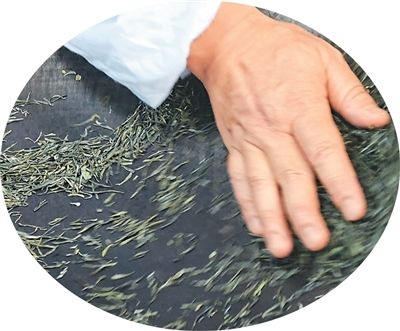 一口温度近180℃的铁锅里,陈盛峰一双苍劲的手,抓、荡、扣、推、抹,新鲜的茶叶在锅里起落、飞舞……关键处,虎口收放,嫩叶在手心不断揉搓,清幽的香气溢出来,一片片舒展的叶子变成了一根根松针状。