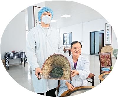 陈盛峰父子展示炒制完成的雨花茶外形。