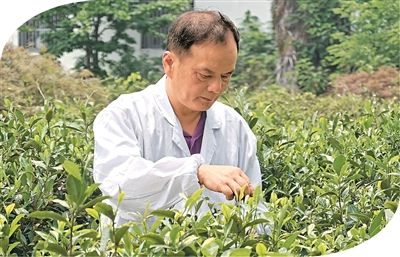 陈盛峰在茶田里观察茶树的长势。