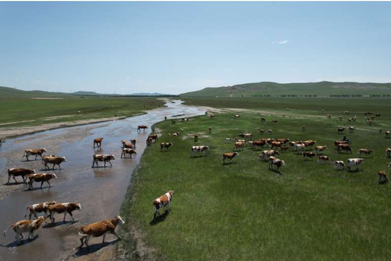 6月17日,内蒙古通辽市扎鲁特旗,牛群在夏营地悠闲吃草。(图片来源:本文图片均据中新社)