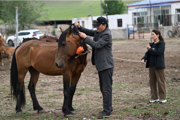 6月15日,内蒙古通辽市扎鲁特旗,斯日古楞(左一)在转场前为种公马佩戴GPS定位器。