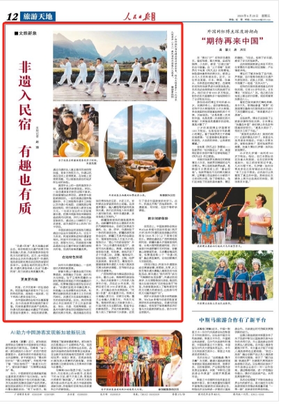 广西阳朔民宿与精品酒店协会会长,墨兰山舍、格格树民宿创始人,陈式太极拳第十二代传承人陈荣华介绍,历经近30年发展,阳朔目前已有3700多家民宿。近年来,多元融合成为发展趋势,“民宿+非遗”成为重要方向。阳朔水云阁融入茶文化、农耕文化等;墨兰山舍融入古建文化、书法文化等。格格树民宿以太极拳为核心,打造太极文化主题民宿,配备专业的教练团队,开设太极拳课程,让客人深入了解和学习太极拳,还吸引了很多外国游客前来学习。此外,民宿还开展广西油茶制作、非遗画扇、写对联、包饺子等研学课程。