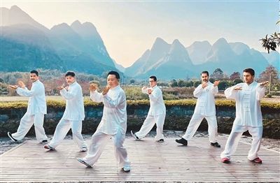 广西阳朔民宿与精品酒店协会会长、陈式太极拳第十二代传承人陈荣华(左三)教民宿的外国客人太极拳。