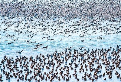 站在鸭绿江口的“最佳观鸟点位”,眺望大海的方向,但见数十万只候鸟如期抵达,涨潮时,它们在空中翩翩起舞,形成壮观的“鸟浪”,轻盈曼妙;退潮时,它们落在滩涂上,停歇、觅食,从容惬意……