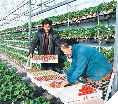 东大于村村民于振华在齐腰高的草莓架旁,采摘鲜果,轻轻放入包装盒中。“这份工作很适合我,就在家门口,方便,收入也不少,忙的时候,得有60多人一起采摘。”