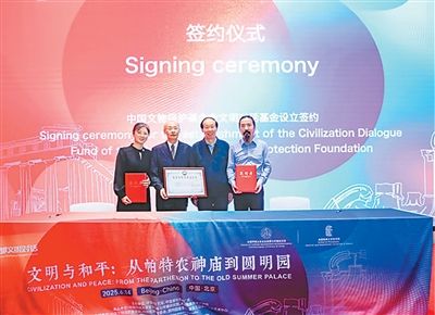 中国文物保护基金会设立了“文明对话专项基金”。在此次活动现场,基金会接受辉煌中轴(北京)供应链管理有限公司首笔捐赠,并举行签约仪式。图为签约现场。主办方供图