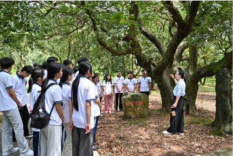 6月19日,一群学生在高州市根子镇贡园古荔枝树下开展研学活动。