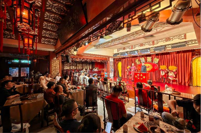 一方舞台,两把椅子,一段天津话的“贯口”刚响起,台下观众便笑声连连。包袱响处,掌声起伏。在天津名流茶馆,每逢周末,市民和游客早早入座。听一段《拴娃娃》《新地理图》,喝一口盖碗茶,笑声从午后延续到华灯初上。