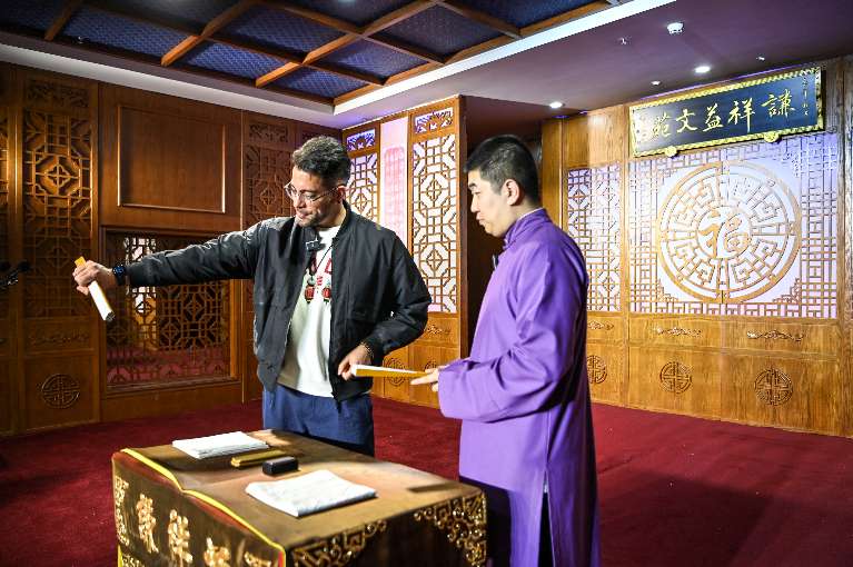 4月24日,在天津市红桥区谦祥益相声茶馆,吴瑞龙(左)和相声演员在台上交流学艺。今年36岁的吴瑞龙来自委内瑞拉,已在中国生活了10年,能说一口流利汉语,现任天津南开大学外国语学院西班牙语系外籍教师。