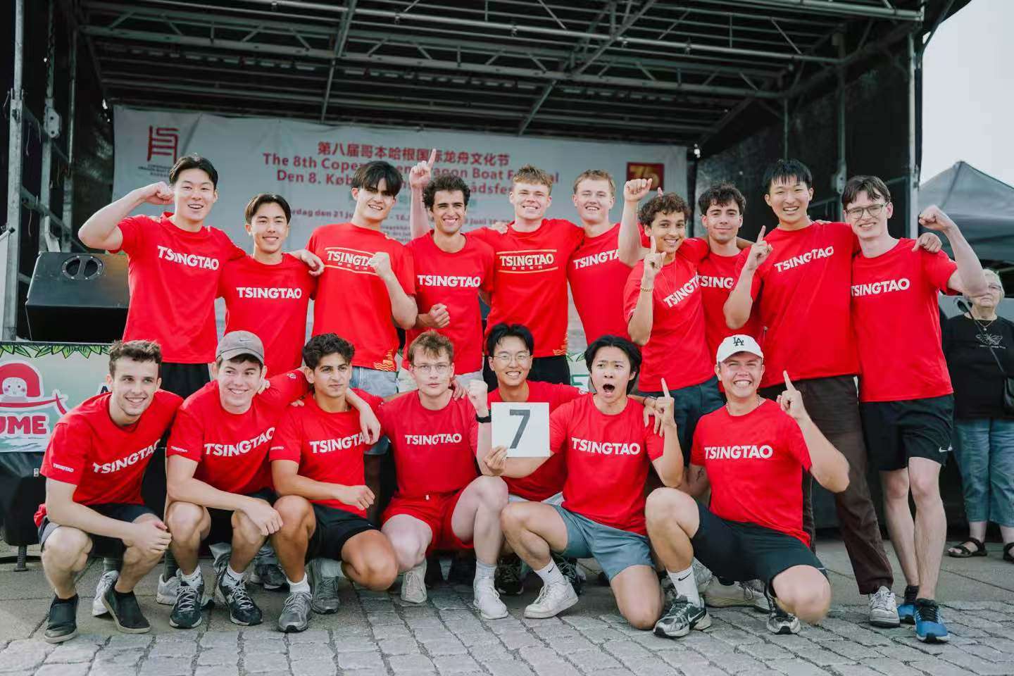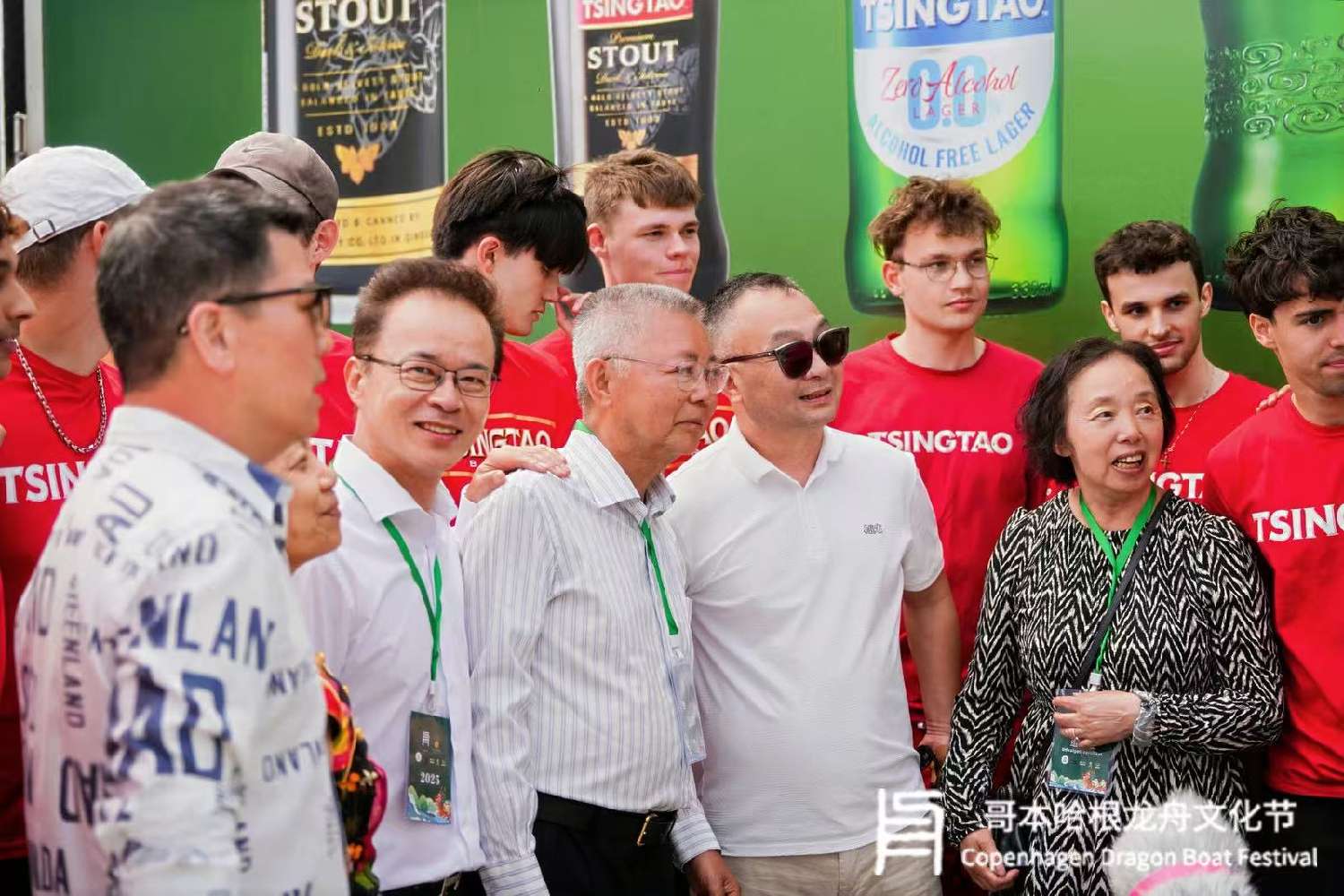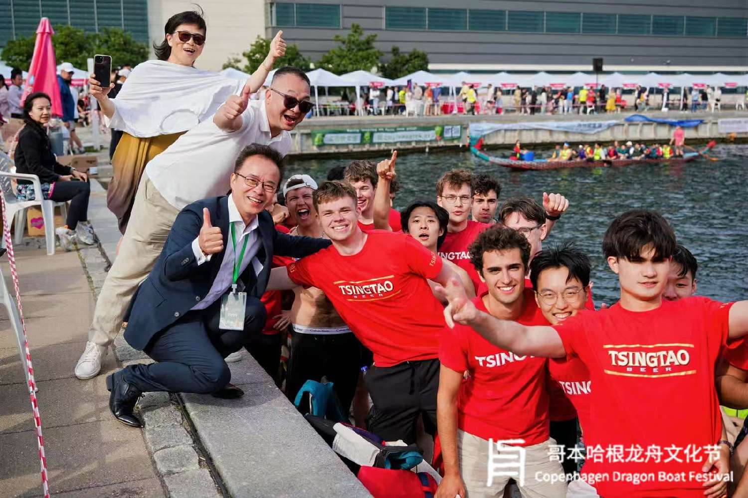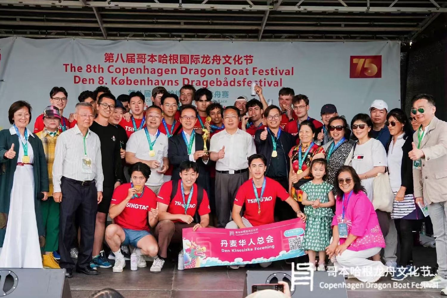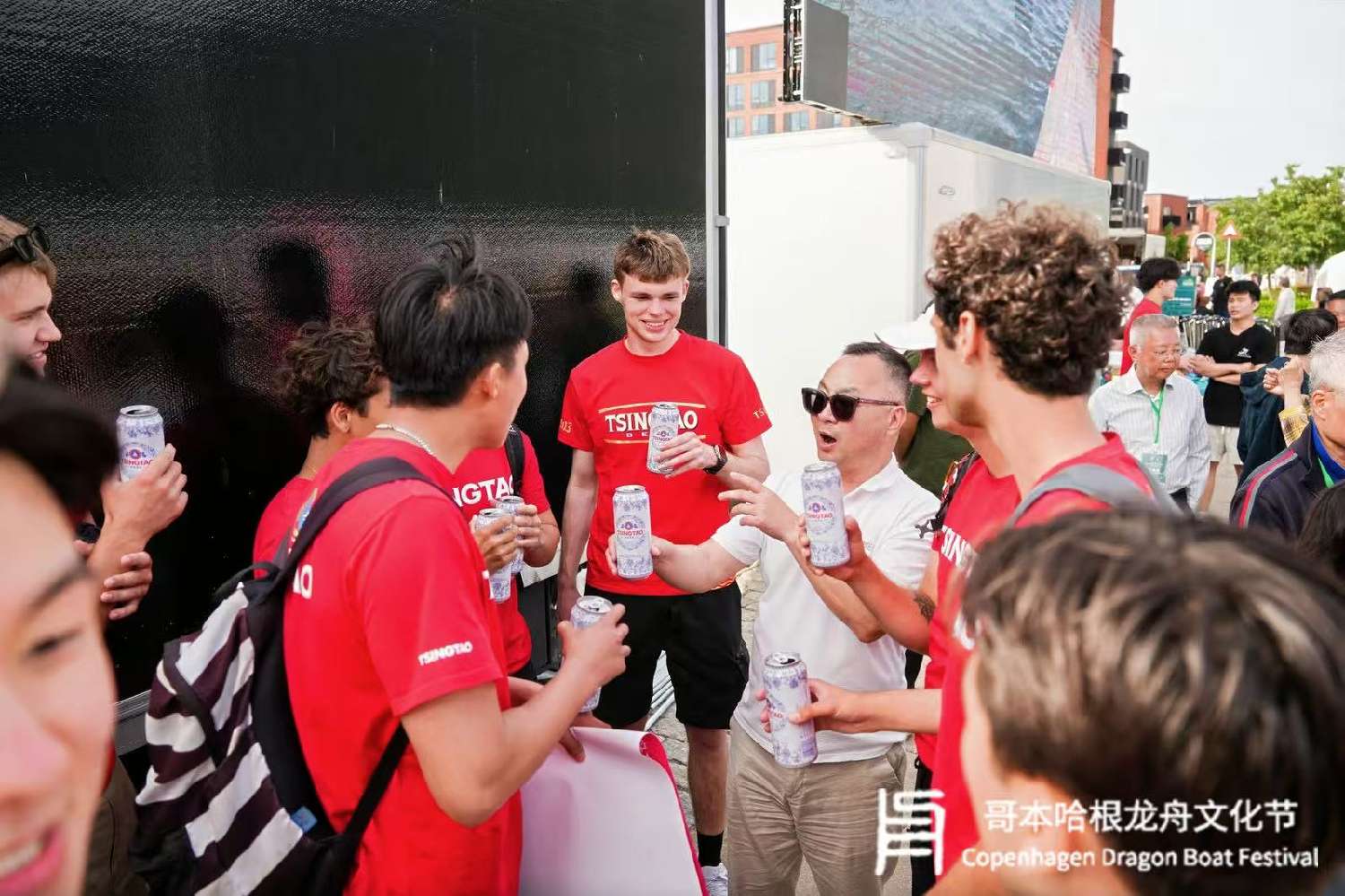 作为这次比赛的赞助商林伟,立即拿来了冰冻的青岛啤酒和学生们一起庆祝这一高光时刻。我们的龙舟队宣传了中国的啤酒、中国的品牌。中国驻丹麦大使馆大使王雪峰亲自为孩子们颁奖,一起欢庆。我们终于赢得了“物美杯龙舟赛”的冠军!