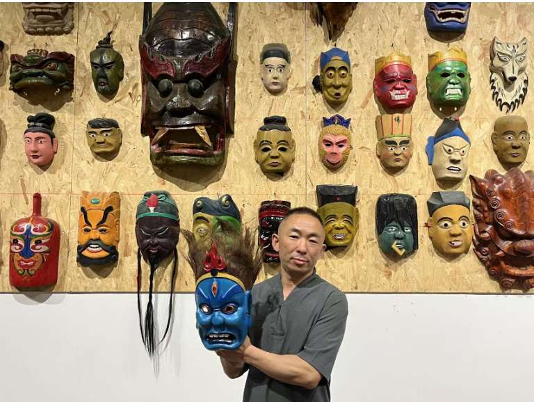 在汪儒斌木工坊的墙壁上,一面挂满60余尊造型各异的傩面具,一面展示着冰箱贴、丝巾等与傩有关的文创产品。